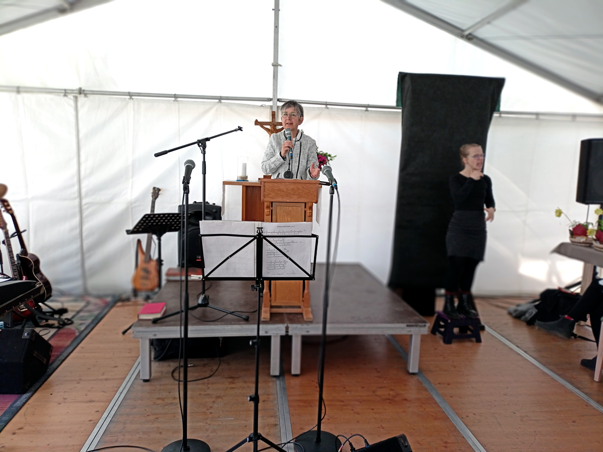 | Im Gottesdienst spielte die Kirchenband aus Bretnig. | Pastorin Astrid Eichler rief in ihrer Predigt zur Dankbarkeit auf. |