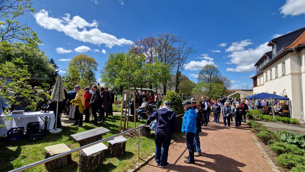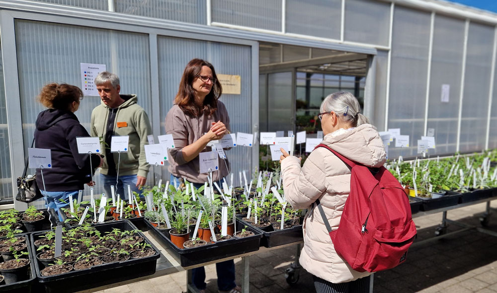 | Überall verweilen Gäste im Gelände. Mittagsimbiss wurde angeboten sowie Kaffee und Kuchen. | Pflanzen aus der eigenen Anzucht boten die Mitarbeiter des Botanische Blindengartens an. |