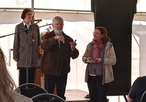 | Einige der von taubblinden Bewohnerinnen und Bewohnern gefertigten zahlreichen Produkte, die den Besuchern angeboten wurden. | LotharHerz aus Thüringen bei seinem Grußwort. Er hat das Storchennest schon sehr oft besucht und hilft bei Seminaren zum Erlernen der Punktschrift und Kommunikation. |