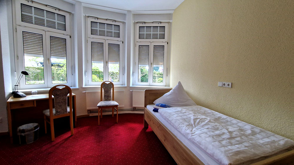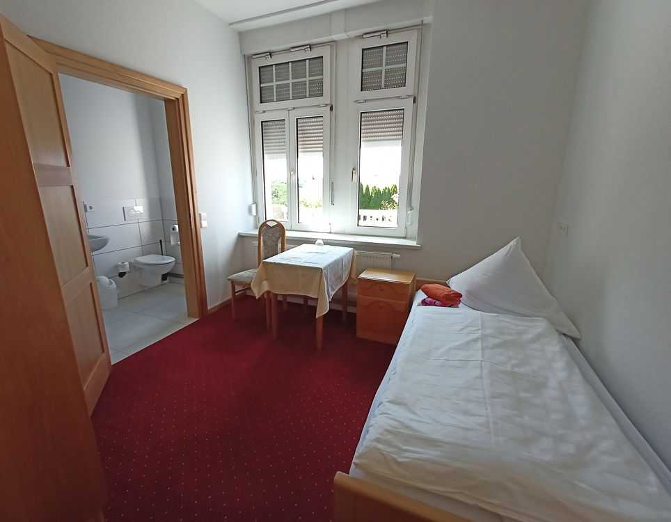 | Zimmer für einen pflegebedürftigen Gast. Dahinter schließt sich ein Zimmer für die Betreuungsperson an. | Zu (fast) jedem Zimmer gehört jetzt ein eigenes Bad. Dieser Komfort fehlte bisher. |